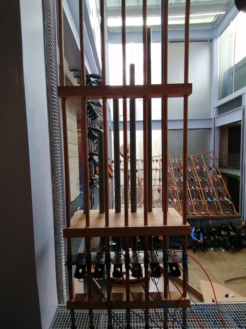 L’idée a fait son chemin et Sole crushing a vu le jour, d’abord en 2024 à la Fondation Prada à Milan, puis à Paris. L’installation a été entièrement redessinée, repensée pour l’espace de Lafayette Anticipations, « en résonnance avec l’architecture verticale du bâtiment ». L’orchestre de Sole crushing occupe donc la partie centrale de l’espace, sur plusieurs niveaux, et le public peut à sa guise rester assis au centre ou déambuler dans les galeries à l’étage, pour une vue plongeante sur l’installation. Cette verticalité a donné naissance à un nouvel instrument à tubes qui évoque à la fois un orgue, un marimba et un carillon.