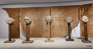 De l’autre côté du couloir, des têtes, réalisées en toile de coton imbibée de résine et fichées sur des tiges de bois (1989/90), alignent leurs faces couturées aux yeux clos, comme des masques mortuaires. Sans doute inspirées par un voyage de l’artiste en Papouasie-Nouvelle-Guinée dans les années 1970, ces sculptures dégagent une impression d’étrangeté et d’interrogation sans fin sur la condition humaine…