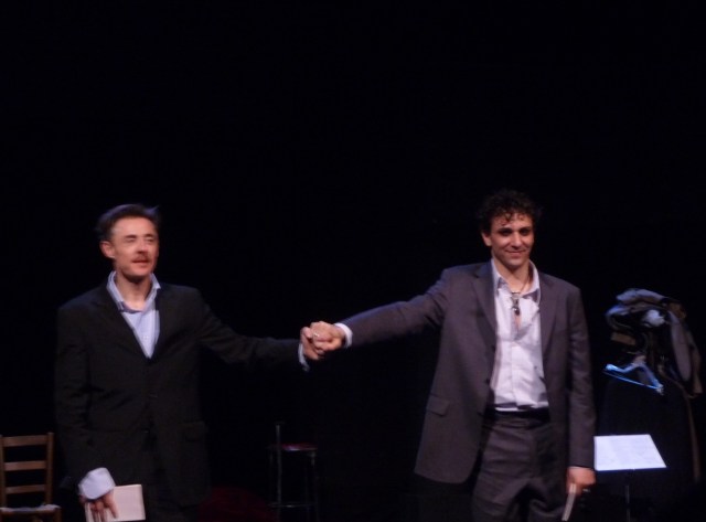 C’est exactement ce qui se passe sur la scène de la Maison de la Poésie, avec la performance d’Alain Fromager, athlétique et subtil, tour à tour inspiré ou en connivence avec le public, et son complice à l’accordéon Johann Riche, musicien-acteur qui intervient en contrepoints discrets ou incisifs, pour conclure en une transe musicale assez époustouflante. Oui, un événement décisif pour ceux qui ont la chance d’y assister….