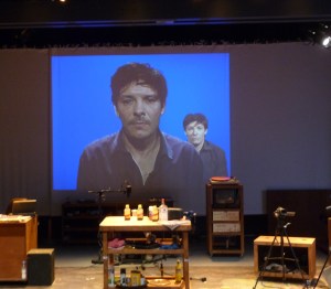Levons tout de suite un doute : l’artiste qui, sur la scène de la salle Topor, passe le balai, range son atelier et met en place ses différents dispositifs de création tout en écoutant les messages sur son répondeur ou monologuant en voix off, ce n’est pas Patrick Sorin, mais un acteur, Nicolas Sansier. Un double génial et confondant, une nouveauté dans l’oeuvre du vidéaste, qui a pour habitude de se dédoubler lui-même et jouer tous les personnages dans ses vidéos. C ‘est comme cela qu’on l’avait découvert, à Nantes, dans l’installation vidéo qui termine le parcours du musée du château des Ducs de Bretagne, où il retrace l’histoire de sa ville natale, de la traite négrière au Petit LU. Un Portrait de Ville documenté, poétique et burlesque où Pierrick Sorin incarne plus d’une cinquantaine de personnages.