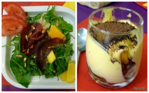 L’odeur du Tian, au four depuis une vingtaine de minutes, commence à se répandre agréablement, se mêlant à celle des pignons légèrement grillés dans une poêle, destinés à la salade de roquette. Un petit conseil glané au passage, concernant la préparation de la sauce à base d’huile d’olive et de vinaigre balsamique : le sel se dissout dans le vinaigre et non dans l’huile. Quant au Tiramisu, mieux vaut le consommer le jour même en raison de la présence des jaunes d’oeufs non cuits, seulement battus avec le sucre et le mascarpone.