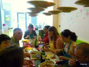 L’atmosphère est détendue autour de Charles Soussin. Il est vrai que la plupart des participants se connaissent. Une remarque s’impose d’emblée : si dans le monde des grands chefs, les femmes sont la minorité, dans celui des « amateurs », la tendance s’inverse. Hervé est le seul homme a revêtir le tablier dans la cuisine de Fraich’attitude. Il en a l’habitude, dit-il.