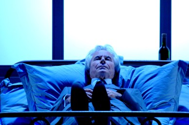 Epilogue : Le monologue sur une scène de théâtre est un défi. François Marthouret le relève. Au début , on s’inquiète un peu : ce décor minimaliste, cet homme à moitié vêtu sur le lit, adossé aux oreillers et qui parle, quasiment sans bouger, avec seulement les inflexions de sa voix et les expressions de son visage, cela va-t-il tenir sur la distance? Eh bien oui ! Le texte et l’acteur s’imposent dans ce décors dont le minimalisme se révèle au final évident : il fallait bien trouver un lieu d’où faire vivre ce texte pour qu’il garde sa puissance évocatrice sans être parasité.