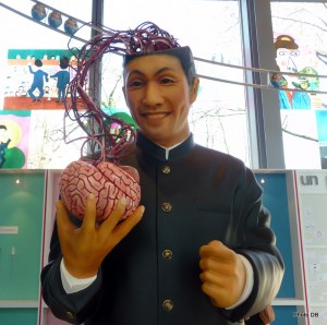 Un univers qui fait écho aux multiples activités et talents de l’artiste et révèle  en même temps ses goûts, passions ou préoccupations …  Sous l’humour, parfois noir ou loufoque, mais toujours impertinent – et le jeu qui fait de l’exposition une sorte de parc d’attractions, Kitano s’exprime, s’interroge et nous interroge. A l’instar du mannequin  qui le représente tenant dans la main droite son cerveau extrait de sa boite cranienne avec l’interrogation Qui es-tu, toi qui me regarde? Monologue intérieur, interpellation du visiteur mais aussi évocation du terrible accident de scooter qui a failli lui coûter la vie au milieu des années 1990 et à la suite duquel il a refusé une craniotomie ….