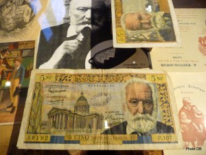 On mange et boit avec Hugo, on fume, on écrit, on lit, joue, chante, s’habille et même se meuble … Les objets sont en effet déclinés dans leur lien avec les activités du quotidien. Ce parcours de l’exposition reprend en fait les catégories selon lesquelles le collectionneur avait organisé les trésors de son « musée populaire », un peu à l’image des rayons des grands magasins. Et, paraphrasant le slogan publicitaire de l’un d’entre eux, aujourd’hui fermé, on peut dire qu’on trouve vraiment tout au bazar hugolien ! D’autant qu’il n’a cessé de s’enrichir au XXe siècle – tiens on l’avait oublié ce billet de Cinq Nouveaux Francs à l’effigie du patriarche – et au XXIe notamment avec la célébration du bicentenaire de la naissance de Victor Hugo.