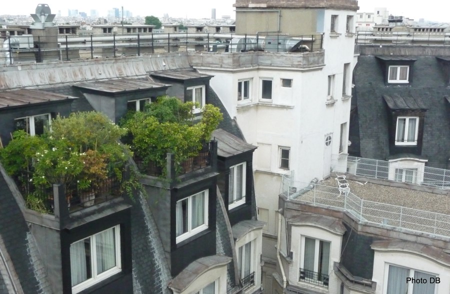 Lutétia, vue sur cour. Derrière les balcons ornés de verdure, l’appartement d’une « résidente permanente » de l’hôtel. Au fond, sur la terrasse, un banc laissé par Pierre Bergé / DB