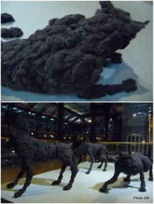 On retrouve Mark Dion dans la Grande Galerie de l’Evolution avec deux œuvres, dont l’installation Fieldwork 4. Une structure transparente abrite un mélange de cabinet de curiosités, laboratoire scientifique et atelier de bricolage où des animaux conservés dans le formol cohabitent avec des accumulations d’objets déchets de la société industrielle, comme des canettes de boissons vides, des ballons de sports dégonflés, etc… Tandis que La Meutede Lionel Sabatté et ses loups réalisés en moutons de poussière hantent de leur présence fantasmatique et inquiétante la pénombre de la Grande Galerie de l’Evolution.(3)