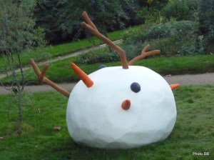 Côté jardins, si l’on entame ce parcours d’art contemporain par l’entrée Austerlitz, la première œuvre rencontrée est le Mutant d’Olav Westphalen. Le fait que l’artiste, qui vit et travaille à Stockholm, ait été par le passé dessinateur de presse a sans doute à voir avec la caricature de bonhomme de neige qui accueille les visiteurs. Au premier coup d’œil la forme semble répondre au concept, mais on se rend vite compte que sur la masse blanche rien n’est vraiment à sa place…