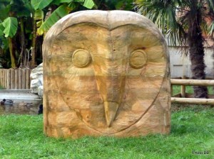 Le matériau privilégié par Laurent Le Deunff est le bois. Deux sculptures de l’artiste français ont pris place dans La Ménagerie, sur la pelouse autour de la Rotonde, là ou les tortues des Seychelles prennent leurs quartiers d’été. L’installation de la Tête colossale – celle d’une chouette – et du Monument à la promesse tenue à proximité de ce symbole de longévité que sont les tortues (4) renforce le côté ancestral et totémique de ces deux œuvres.