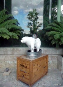 De la condition humaine on passe à celle de l’animal, en l’occurrence des ours, avec Iceberg & Palmtrees, une œuvre de Mark Dion sous le péristyle d’entrée des Grandes Serres, tandis qu’à l’intérieur la nymphe Platée revisitée par Alain Séchas, inscrit sa présence à la grâce humoristique, ton sur ton avec la végétation exotique.