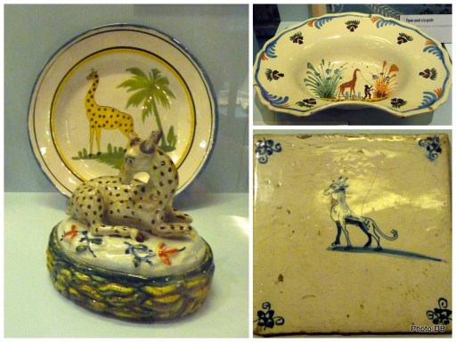 La seconde salle de l’exposition évoque la « girafomania » qui a sévi au cours des années suivant l’arrivée de Zarafa. On peut voir un échantillon des objets de toutes sortes réalisés à son effigie : bonbonnières, assiettes, carreaux de faïence, plats à barbe, tabatières, papiers peints, carnets de bal, médailles, etc. sans parler de la mode de « la couleur girafe »… les caricaturistes et pamphlétaires se sont aussi emparé de l’animal pour critiquer le régime de Charles X.