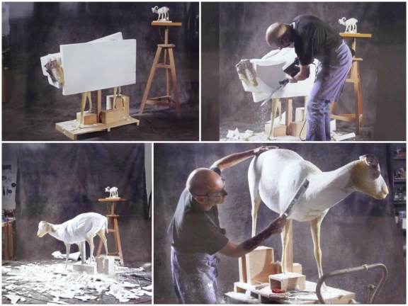 On apprend que tête et pattes sont faites en mousse de polyuréthane, tandis que le corps est réalisé à partir de plaques de polystyrène, un polystyrène spécial très compressible dont la consistance s’apparente à celle du balsa. Les plaques sont taillées au départ à la scie électrique pour obtenir le volume général, puis à la main avec couteaux, rasoirs, râpes, papier de verre. « Il vaut mieux pas se tromper », précise Jack Thiney, le matériau ne se prêtant guère aux repentirs. Le terme de « sculpture animalière » prend tout sons sens, dans la progression des formes modelées sur celles de la maquette…