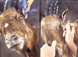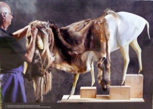 Revenons à notre mouflon. Cet ancien hôte du grand rocher du zoo de Vincennes a été victime d’un hiver particulièrement rude : il a glissé sur une plaque de verglas et s’est fracassé l’os du… rocher ! Circonstances fatales qui en ont fait un spécimen « idéal du point de vue du taxidermiste (…) On était en hiver, donc le poil était magnifique, et comme il a été tué sur le coup il ne s’est pas abîmé ». Seul bémol, ses cornes « étant complètement usées par le ciment du zoo de Vincennes n’étaient pas présentables, il a fallu faire un moulage de l’os de son crâne et trouver des étuis cornés d’un autre animal qui puissent s’y adapter ». Toujours le souci de l’exactitude scientifique et de la perfection esthétique…