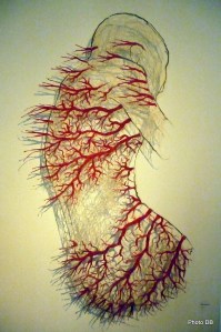 Comme les créations de l’artiste finlandaise Raija Jokinen qui mêlent peinture, graphisme et art textile sur le thème du corps humain. Avec Rush, un corps esquissé de dos s’orne en surface de ramifications brodées en relief, telles un réseau sanguin ou un enchevêtrement de rhizomes sortis de terre, dans une troublante et poétique fusion de l’humain et du végétal, du sang et de la sève.