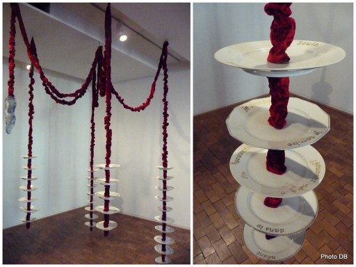 Quant à Françoise Quardon, son installation Colonne de larmes, se distingue tout d’abord par l’harmonie de son architecture d’assiettes en suspension et la juxtaposition des textures et couleurs, velours rouge et faïence blanche. Puis elle se déchiffre, au sens propre, quand en s’approchant, on découvre que ces assiettes sont porteuses de messages découpés en séquences : Seule/je tombe/souvent/dans le néant, lit-on par exemple. À chacun(e) de prendre son temps pour interpréter ces messages à l’aune de son propre imaginaire…