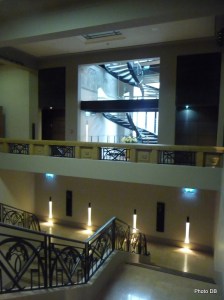 Cette salle a été le point de départ des travaux dans « un bâtiment qui n’était pas en très bon état, mais aux capacités extraordinaires, explique l’architecte. Il s’agissait donc de reprendre possession de cet espace, de remettre en exergue ce qui était intéressant, comme les reliefs des murs et des plafonds, tout en leur donnant une présence discrète, en opposition aux couleurs dont ils avaient été recouverts […] Ensuite, les accès dans les étages, adaptés aux exigences actuelles de sécurité et d’accessibilité, avec de nouveaux accès verticaux, escaliers et ascenseurs, tout en utilisant le ‘vocabulaire existant’, comme le fer forgé ». (2)