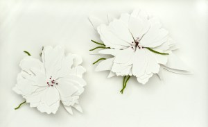 Il y a aussi ces fleurs, mêlant papier – là aussi, le temps est présent par la patience qu’il aura fallu pour un découpage/ciselage manuel -, broderie et épingles peintes. Avec Transformations Catherine Noury essaie de traduire les nuages et leur mouvement qu’elle a magnifiquement photographiés. Mais les nuages, en quelque matière qu’on essaie de les figurer ne se laissent pas facilement capturer, comme en témoigne cette tentative de nuage en sculpture de dentelle qui deviendra finalement une série de dessins à l’encre et aquarelle.