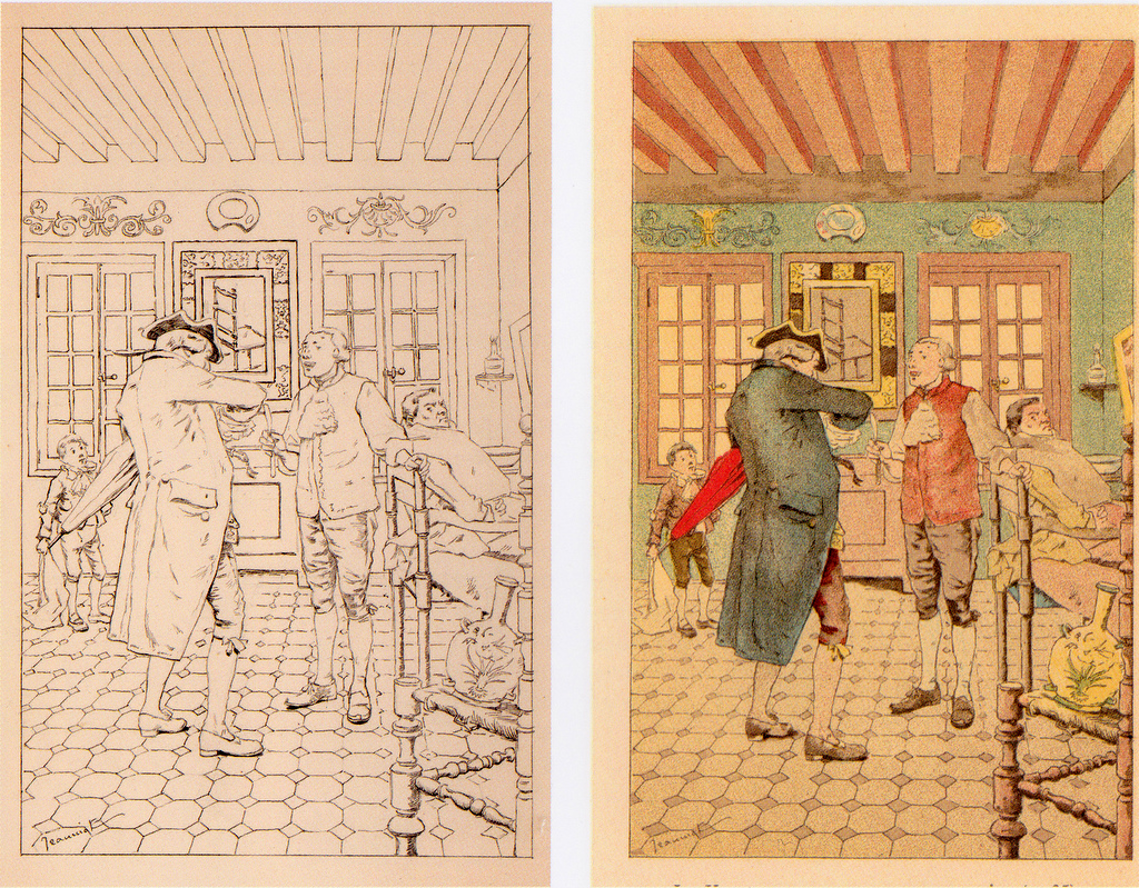 « Le voyageur va payer son perruquier », dessin de Pierre-Georges Jeanniot et lithographie de Charles Gillot / coll. Musée des Avelines