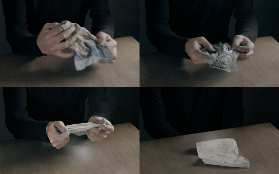 La feuille de papier aura été l’instrument de la transformation de l’oeuvre… Avec Revers (2017), c’est le papier qui se transforme progressivement au contact des mains qui, dans un geste répété, froissent et défroissent une page de magazine, dont l’image disparait progressivement tandis que l’encre de la page s’imprime sur les mains et que la feuille de papier se transforme en une sorte de peau… Papier encore, cette feuille de papier blanc , mais qui cette fois se consume, jusqu’à disparaître entre les mains qui la tiennent, à partir d’un petit trou en son centre, comme celui que ferait une cigarette (Source, 2016). On s’interroge tout de même sur la perfection persistante du cercle dessiné par la combustion.