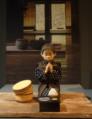 On apprend ainsi que la figurine intitulée Gare (1997), représente « un garçonnet de la campagne envoyé travailler en ville, phénomène fréquent durant les ères Meïji (1868-1912) et Taïsho (1912-1926). On sent son inquiétude tandis qu’il attend son patron à la gare ». Quant au Plateau-repas (2010), son mode d’emploi nous est détaillé :« On dépose sur le couvercle retourné (…) les aliments contenus dans la boite. À la fin du repas, on verse de l’eau chaude dans le bol et, du bout des baguettes, on nettoie le bol et les plats avec un morceau de légume mariné. Pour finir la vaisselle est rangée dans la boite. Une coutume aujourd’hui disparue ». La scénographie installe le personnage dans son décor …