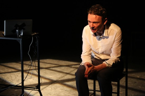 Le comédien, pantalon gris et chemise blanche, accueille les spectateurs qui prennent place dans la petite salle, à l’instar des participants au colloque devant lesquels un praticien s’apprête à faire une communication sur une erreur de diagnostic. Sur la scène une table avec une chaise et un ordinateur portable, d’autres chaises sont alignées au fond, il y a des verres, de l’eau, comme il convient à un conférencier.