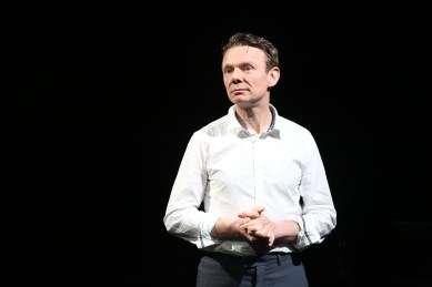 Ce parcours, ces mots et les émotions qu’ils suscitent, Benoit Giros les a fait siens. Seul sur scène, le comédien incarne Louvier ainsi que tous les personnages – le psychiatre conférencier, l’ancien et le nouveau psychiatre, son oncle, les voix qu’il entend – qui font partie de son histoire, passée et présente. Sa présence aussi intense que sobre, son jeu subtil où alternent l’angoisse, la colère, le désespoir, la folie, l’hésitation, l’ironie emportent l’adhésion du spectateur à ce cheminement douloureux pour que « la vérité arrive à la surface ».