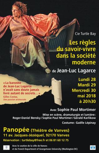 Du 28 au 30 mai 2018, la comédienne Sophie Paul Mortimer revient sur la scène de la Salle Panopée à Vanves pour trois nouvelles représentations de la pièce de Jean-Luc Lagarce. En juin 2017 on avait apprécié l’interprétation ardente qu’elle avait donnée, seule en scène, de ce texte singulier, un des derniers de l’auteur, écrit et créé en 1994. « Les règles du savoir vivre dans la société moderne » est inspiré de l’ouvrage éponyme – et à succès – de la baronne Staffe publié en 1889. Ce manuel des convenances dans le monde de la haute bourgeoisie, Jean-Luc Lagarce en a dynamité le verbe et la syntaxe pour livrer un texte drôle et corrosif où il pointe avec une ironie mordante la famille, l’amour, la mort, la solitude et les faux-semblants de la société.