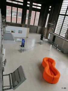 Exposition Gunaikeion, La chaufferie. Au 1er plan le canapé de Ken Lum / Photo db