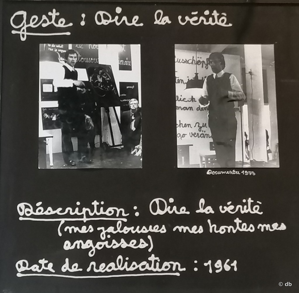 Au visiteur qui, justement, souhaite aller à la découverte de l’oeuvre de Ben dans sa chronologie, on conseillera de commencer le parcours, non par le château, comme l’indique le circuit officiel, mais par l’Orangerie où est présentée la partie historique de l’exposition avec une sélection d’œuvres significatives des années 1958 à 1978. Pour illustrer ces années, des documents de l’époque sont présentés : affiches, archives photographiques et vidéos, ainsi qu’une sélection des performances de Ben intitulées « Gestes ».