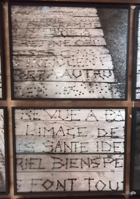 Le moment est venu pour le visiteur d’aller se confronter à la matérialité de cet objet. Sous la voute de pierre, le plancher frappe d’abord par ses dimensions (13m2). Avant de se pencher sur le contenu du texte dont la transcription est reproduite sur le mur, comme au chevet de ce gisant de chêne, on mesure l’énergie et la détermination qu’il a fallu à son auteur pour le graver dans le bois, en taillant et perforant. Le mot acharnement vient à l’esprit, cette « ardeur furieuse et opiniâtre dans la lutte, la poursuite, l’effort », comme le définit Le Robert.