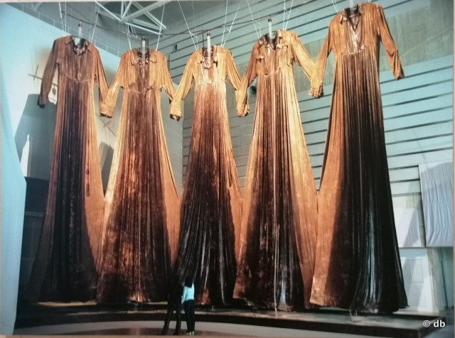Désormais installée à Berlin Chiharu Shiota y poursuit son œuvre où l’entrelacement des fils – rouges ou noirs – prend de plus en plus d’importance, tandis que sa présence corporelle fait progressivement place à celle d’objets : robes (After that/ Après cela – 1999) et (Memory of skin / Mémoire de la peau -2001), vieilles chaussures (Dialogue fron DNA / Dialogue à partir de l’ADN – 2004)… jusqu’à cette monumentale installation de valises usées (Accumulation searching for the Destination/Accumulation – en quête de la Destination – 2014) reproduite dans l’exposition. Toutes ces valises, qu’on suppose pleines, sont suspendues au plafond par des fils rouges d’inégale longueur – liens du sang, cordon ombilical ? – comme les marches sans fin de l’exil…