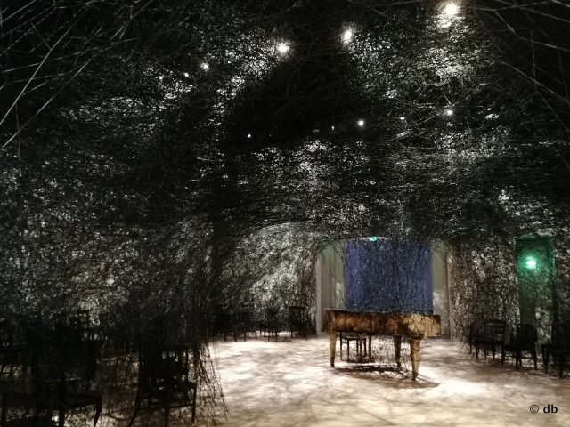 Retour au fil, noir cette fois, avec l’impressionnante installation In Silence -2002/2024. On franchit une porte et pénètre dans une salle de concert où de chaises vides et d’un piano silencieux s’élèvent des fils entrelacés, comme un nuage de fumée qui va s’épaississant pour former un dôme presque opaque sous lequel on se déplace sans autre bruit que celui de sa respiration. Comme souvent dans le processus créatif de Chiharu Shiota, l’inspiration émerge d’une expérience personnelle physique ou émotionnelle. En l’occurrence l’incendie qui s’est déclaré dans la maison voisine de celle de l’artiste alors âgée de neuf ans et « le lendemain, il y avait un piano devant la maison. Calciné, devenu totalement noir, il m’apparaissait comme un symbole encore plus beau qu’avant. Un silence ineffable s’est emparé de moi… ». et il est là ce silence, concrétisé, si l’on peut dire, par ce piano que Shiota a brulé et ces centaines de kilomètres de fil noir qu’elle a entrelacés, enchevêtrés.