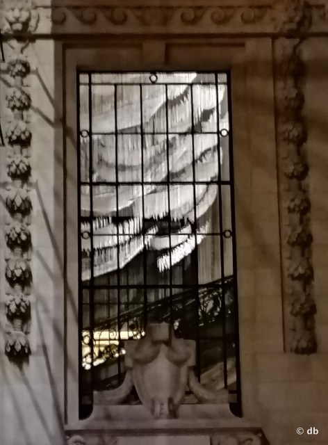 Pendant notre visite la nuit est tombée, et en ressortant du Grand Palais on a un nouveau et dernier regard ému sur l’installation qu’on aperçoit maintenant derrière la haute verrière de l’escalier monumental, dans son encadrement de pierre sculptée …
