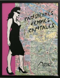 Une œuvre que l’exposition nous propose de parcourir de façon thématique, avec tout d’abord Paris, où Miss.Tic est née et qui a été, comme elle dit elle-même son « terrain de jeu ». On la voit, dans une video, assise avec son chien à la petite terrasse d’un bistrot de la rue des Cinq Diamants, disant « ce qui m’attire dans la rue c’est la vie… et la poésie, c’est la vie, pas juste de la littérature. ». La poésie à laquelle sa mère l’a initiée en lui donnant à lire Prévert, les mots de la poésie auxquels il a fallu ajouter l’image pour qu’ils accrochent le regard, a-t-elle constaté. C’est donc en plasticienne et poétesse, en mêlant dans l’espace public texte et dessin – une silhouette féminine à la fois séduisante et irrévérencieuse – que Miss.Tic (1) s’est imposée dans un milieu jusqu’alors essentiellement masculin.