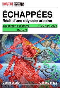La Fondation Desperados pour l’art urbain (1) présente jusqu’au 30 novembre 2025 une exposition collective imaginée par l’artiste Alëxone Dizac, auquel elle a donné carte blanche. Ce dernier a sollicité une douzaine d’artistes d’horizons et de pratiques très diverses – même si, pour la plupart et à l’instar d’Alëxone (2), ils sont issus du graffiti et du muralisme. Installations, sculptures, céramiques, dessins, illustrations, fresques s’offrent au visiteur, dans un vaste lieu insolite et éphémère au cœur du IXème arrondissement de Paris et dans un parcours balisé par les chapitres d’un récit, Échappées, récit d’une odyssée urbaine, écrit spécialement pour l’occasion.