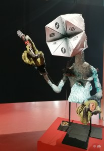 Les contes de l’enfance sont aussi peuplés de monstres… dont 100TAUR ( alias Nicolas Giraud, né en 1982 à Montauban) fait son affaire. Il y en a deux là, bien visibles : Démon Cocotte et Gastornis Fantasmagoris, tandis qu’un troisième, L’Effondrement, se dissimule un peu plus loin dans l’obscurité d’une ancienne chambre forte… L’artiste puise son inspiration tant dans les mythologies du monde entier que dans la littérature fantastique (Edgar Allan Poe, Lovecraft, etc) et les comics. Et, surtout, il est passionné de techniques et animé par « le souci du détail ». D’où sa référence à la taxidermie et l’utilisation du polyéthylène pour la réalisation de ses « monstres » et les mille et une « histoires secondaires » qui peuplent ceux-ci d’une myriade d’objets et de fragments en tout genre, dans un processus à la fois obsessionnel et ludique quasiment sans fin. On conseille au visiteur d’oublier le monstre et d’examiner les détails qui y fourmillent, avec la patience du pêcheur à la mouche qu’est aussi l’artiste.