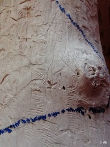 En l’occurrence un Cedrela, dans la forêt du Guanascate au Costa Rica, « un bois rouge imputrescible et amer », précise-t-il, qu’il a sculpté sur place pendant 40 jours, en suivant chaque jour le même sentier jusqu’à l’arbre situé sur une hauteur d’où il découvrait l’étendue de la forêt ; l’ensemble est documenté par un film et les photos de Balint Pörneczi. Si l’oeuvre – CaminoBlu 4363 – est restée sur son lieu d’origine, une « réplique » (Arbre bleu 2800) figure dans l’exposition, sculptée dans un frêne du Morvan, enduit d’un blanc mat parcouru d’une nervure bleue évoquant le sentier parcouru chaque jour et la couleur du papillon également familier de ce chemin.