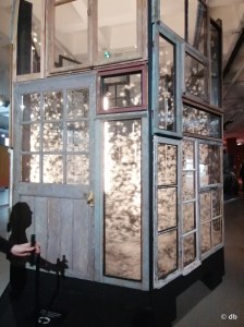 L’Enfance… Promenons-nous dans les bois, l’installation de Madame (pseudonyme d’Aurélie Ludivine Bidault, née en 1982 à Tours) nous y ramène avec sa petite cabane recouverte de feuilles mortes qui tapissent aussi le sol alentour. À l’intérieur on découvre un abri à la fois mystique et ludique avec un sol de confettis, un prie-dieu ancien recouvert de tapisserie, une boule à facettes au plafond, et dans quelques-unes des alvéoles percées dans les murs sont glissés des messages, tandis deux œuvres de l’artiste se répondent avec un message énigmatique : Grise est la matière /Quand elle est traversée de lumière…