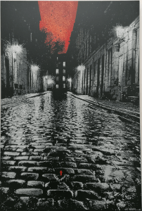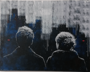 Si la musique – surtout anglo-saxonne – accompagne Jef Aérosol, né en 1957, depuis son adolescence, et si les images sont au cœur de la technique du pochoir que ce pionnier de l’art urbain pratique depuis plus de quarante ans (2), c’est la première fois que les deux sont intrinsèquement liées dans un projet. Durant sa période de retrait, des textes lui sont venus. « Un texte doit déjà être harmonieux, mélodieux, fluide…, explique-t-il, et des images sont venues avec les chansons, un peu comme des scénarios ». Des images qui, de retour dans l’atelier, sont devenues des toiles.