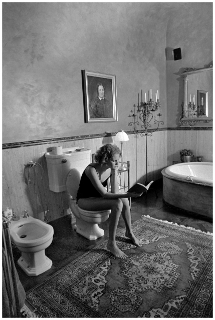 Une pièce comme une autre Jeune femme lisant dans une salle de bain. (Milan – 1997) Ferdinando Scianna / Magnum Photos