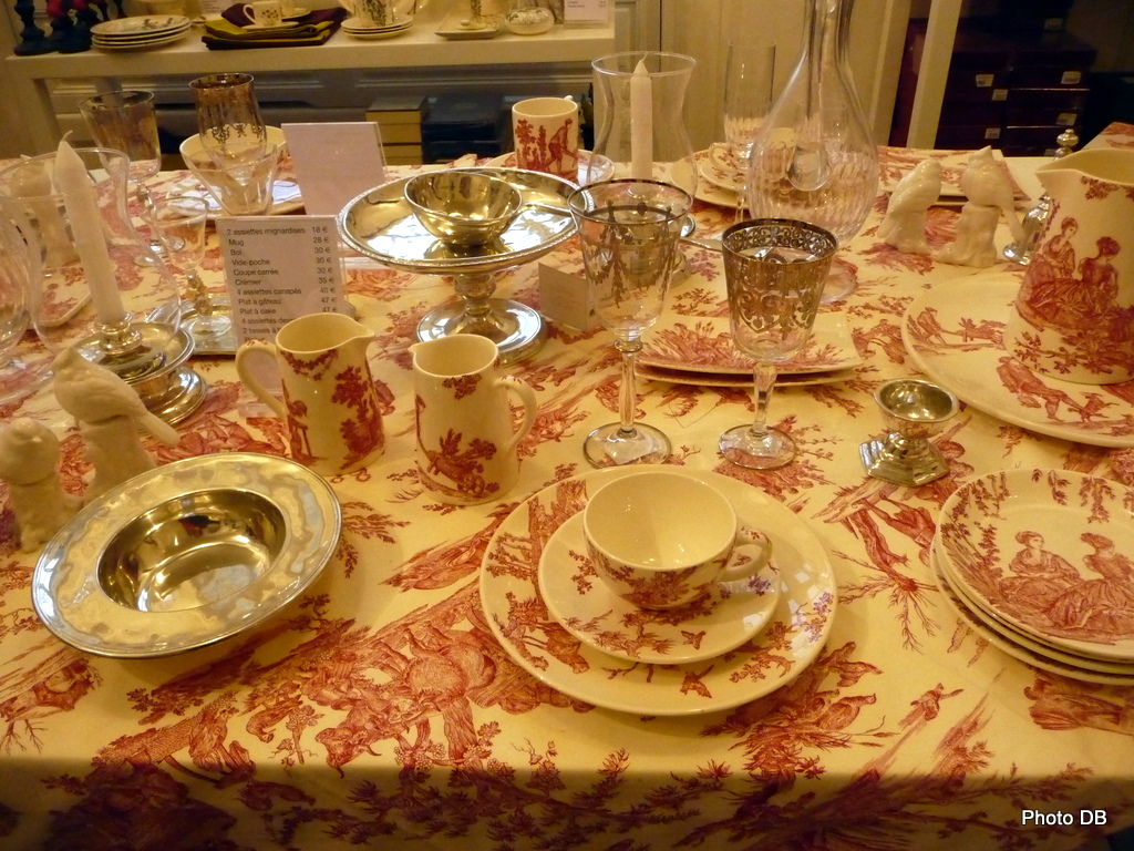Mise en valeur de la Toile de Jouy avec des produits dérivés « Art de la table », présentés à la Librairie des Princes du château de Versailles / Photo db