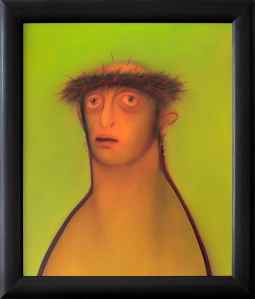 Cela est encore plus troublant dans la sérieEcce où le même visage subvertit le sens religieux du sujet biblique Ecce Homo. Cette subversion est aussi à l’œuvre dans les deux portraits La Religieuse et La Petite Religieuseou dans le portrait de ce qu’on identifie comme une « papesse », en dépit de la dérision du titre, Les Poissons rouges, en référence à l’imprimé de la robe… Isabel Carlos y voit un « écho de la conscience féministe au sein de la culture portugaise […]. Féminisme et religion, un mélange aussi explosif que les rouges de l’artiste ».