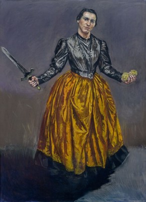 Quant au tableau O Anjo, impressionnante figure féminine d’ange à la fois gardien et vengeur, glaive dans la main droite et éponge dans l’autre, symboles de la Passion du Christ, on peut y voir – au-delà de l’histoire (O crime do Padre Amaro) qu’il conclut (4) – comme une représentation à la fois réaliste et symbolique de la femme : forte, déterminée et agissante, telle que la sait et la souhaite Paula Rego…
